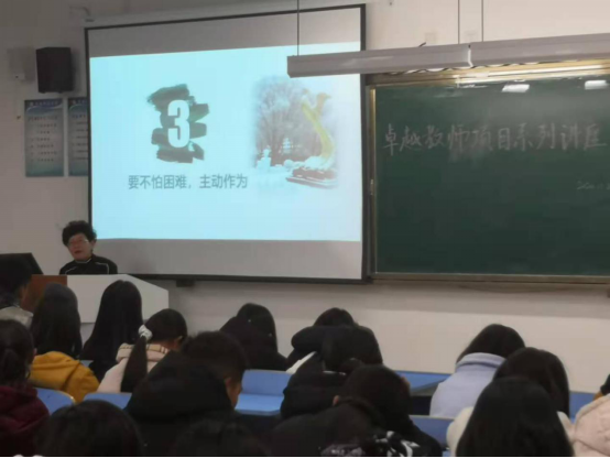 为了让师范生了解中学教育教学环境、熟悉中学班主任工作及提升教师职业素养,11月22日晚,beat365英国官网邀请虎台中学高级教师、西宁市优秀班主任陈京利老师做了“润物无声,春风化雨—班主任工作与教育教学艺术”为主题的专题讲座。陈京利老师曾获“全国三八红旗手”、“青海省优秀教师”、“青海省三八红旗手”、“西宁市学科带头人”、“西宁市优秀教师”、“西宁市骨干教师”等荣誉称号。学院2020级和2019级地理科学专业120余名学生参加了活动。