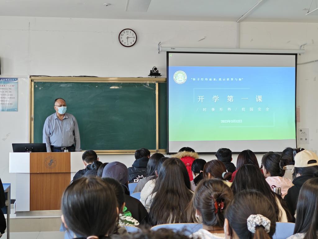 学院党总支副书记洛加才让以“时事形势与校园安全”为题开讲,以俄乌局势为例,引导学生正确认识和平稳定发展的主流,自我强化中华民族共同体意识,树立正确政治意识。并通过实际案例向学生讲述校园安全的重要性,特别是就教育于宗教相分离原则进行详细阐述,向同学们提出具体要求。