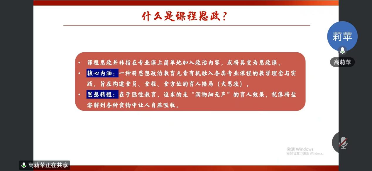 为深入贯彻落实习近平总书记关于教育的重要论述及全国高校思想政治工作会议精神,全面推进课程思政建设与专业教育深度融合,切实提升教师课程思政育人能力,2025年11月3日,beat365英国官网组织全体教师开展课程思政专题线上座谈交流会。本次会议特别邀请马克思主义学院高莉苹副教授担任主讲嘉宾,围绕课程思政建设的核心命题展开深度分享。