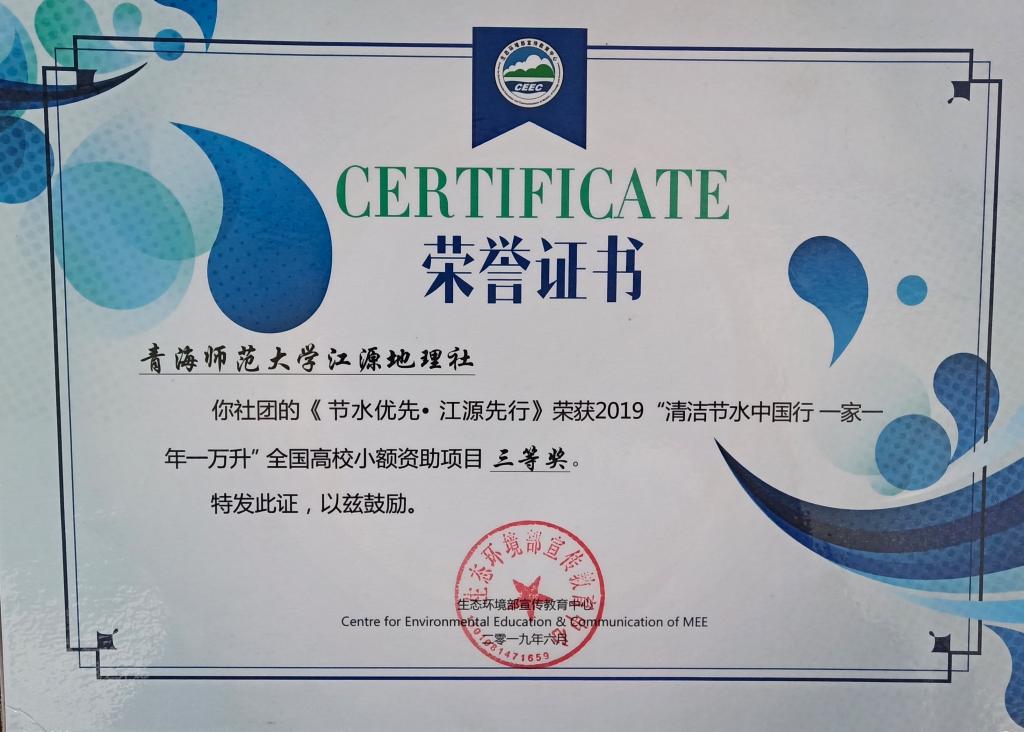盛夏七月传捷报,金秋十月得收获。由生态环境部宣传教育中心主办的全国小额资助项目“清洁节水中国行,一家一年一万升”获奖名单已揭晓,beat365英国官网江源地理社参选的“节水优先,江源先行”项目荣获三等奖。