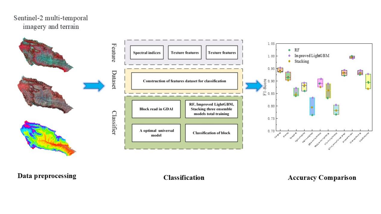 针对上述,本研究提出了一种子区域集成学习分类框架,旨在获取流域尺度的精细LULC分类产品,提高流域尺度制图的准确性和分类效率。该研究以青海湟水流域为研究区,选择Sentinel-2A/B多时相数据进行集成学习分类。根据所提出的方法,对比分析了RF、Improved LightGBM、Stacking三种集成学习方法。所提出的流域尺度集成学习框架在LULC制图方面具有更好的准确性和分类效率,并且相较于其他方法具有一定优势。本研究中提出的方法为流域尺度的LULC制图技术提供了一种新的思路。