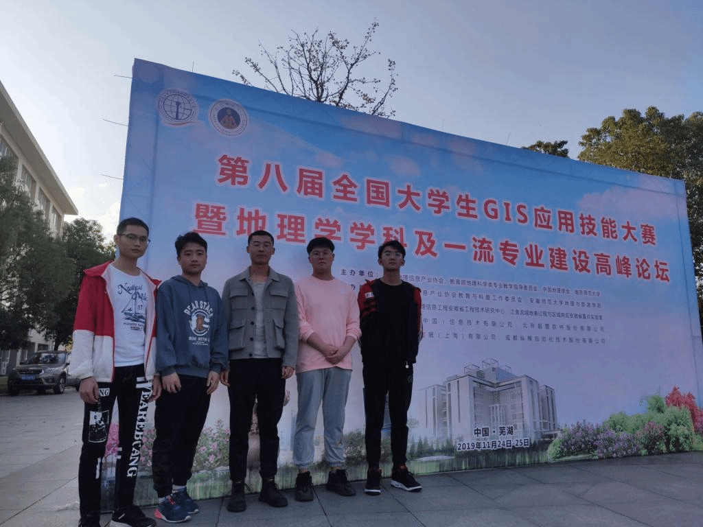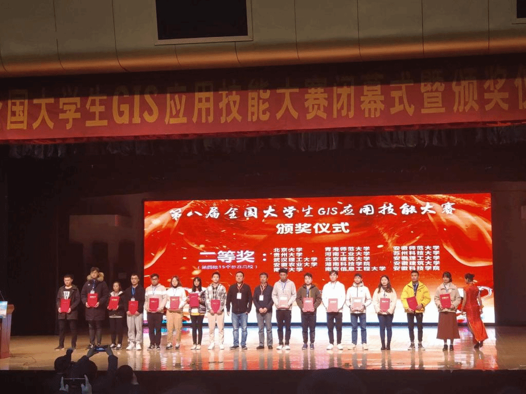 11月24日由中国地理信息产业协会、教育部地理科学类教学指导委员会、中国地理学会主办的第八届全国大学生GIS应用技能大赛在安徽师范大学举行。beat365英国官网贾伟老师指导蔡建军、张峻豪、曾琪铖、黄甫觉同学经过紧张激烈的竞争角逐,最终与北京大学、南京大学等著名高校同获得技能大赛二等奖的佳绩。
